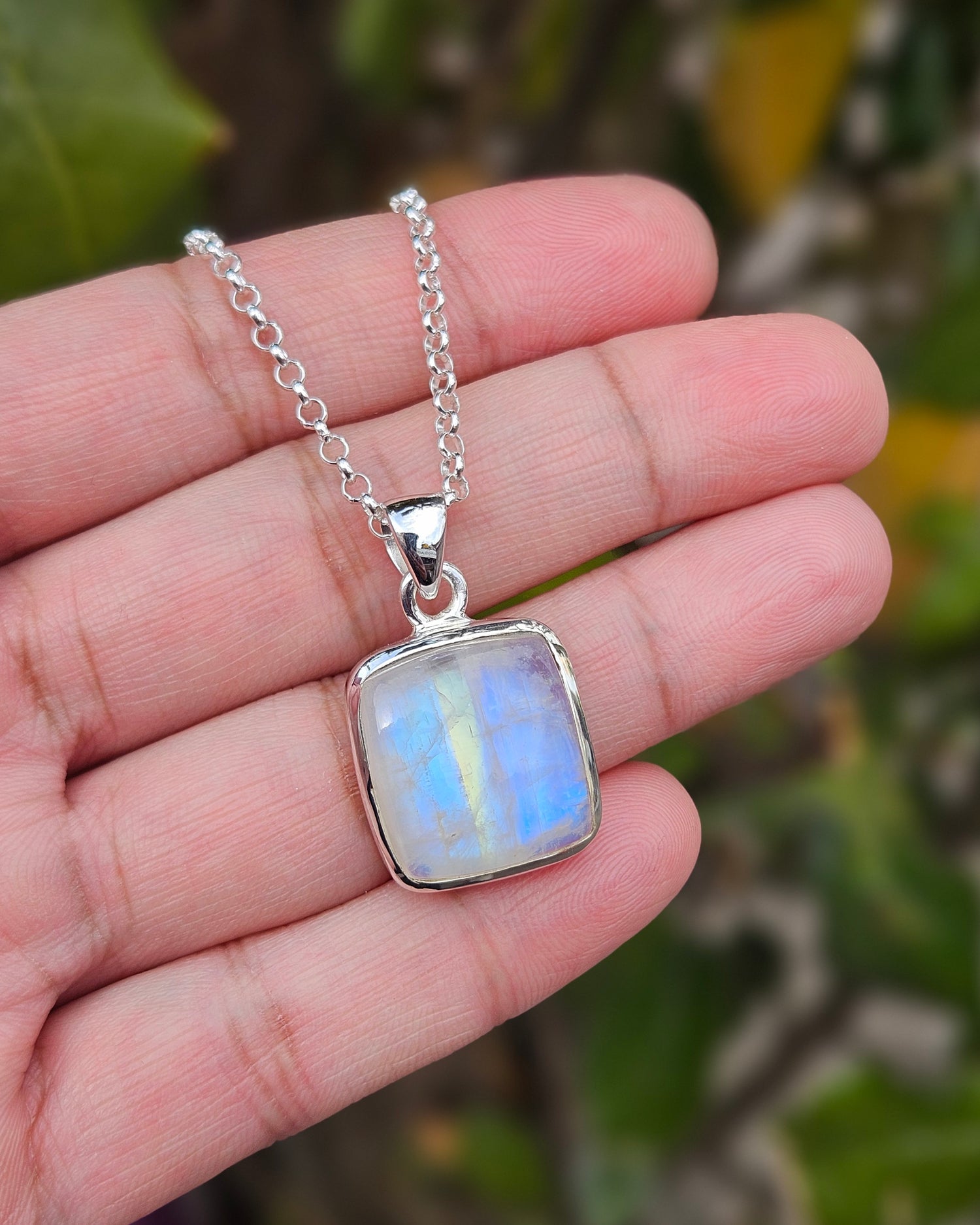 Style and symbolism come together in this elegant pendant with a square cabochon-cut moonstone. The softly shining stone is set in 925 sterling silver and exudes peace and refinement. The matching sturdy silver jasseron chain gives the whole a timeless and powerful look.