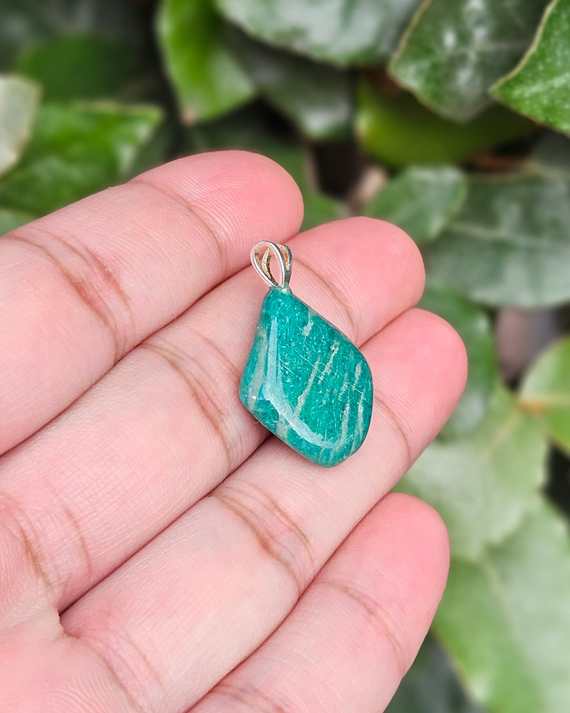 The pendant features a 925 sterling silver eyelet, making it easy to wear on a chain. The soft turquoise to blue-green hues of amazonite create a fresh and natural look, suitable for both casual and more stylish outfits.