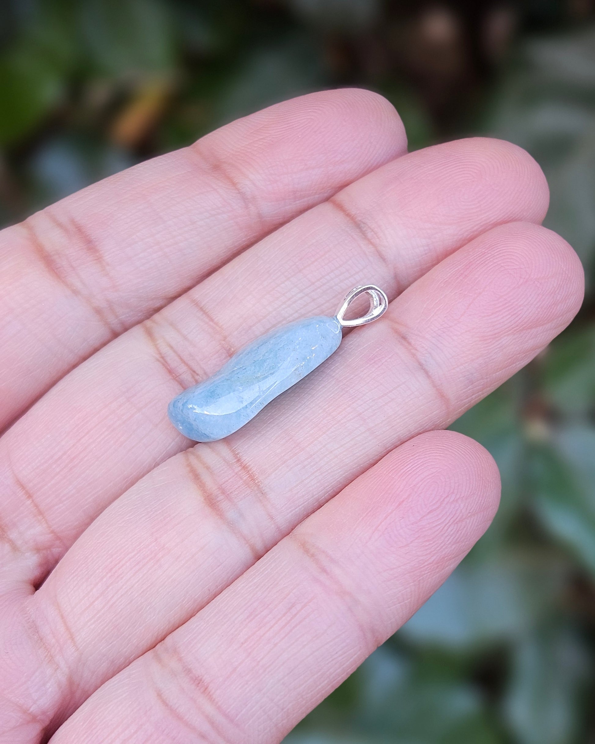 A stylish and pure aquamarine pendant, freely cut and set with a silver eyelet. Aquamarine has a strong calming effect and helps organize thoughts. It is often used to enhance communication and self-expression.