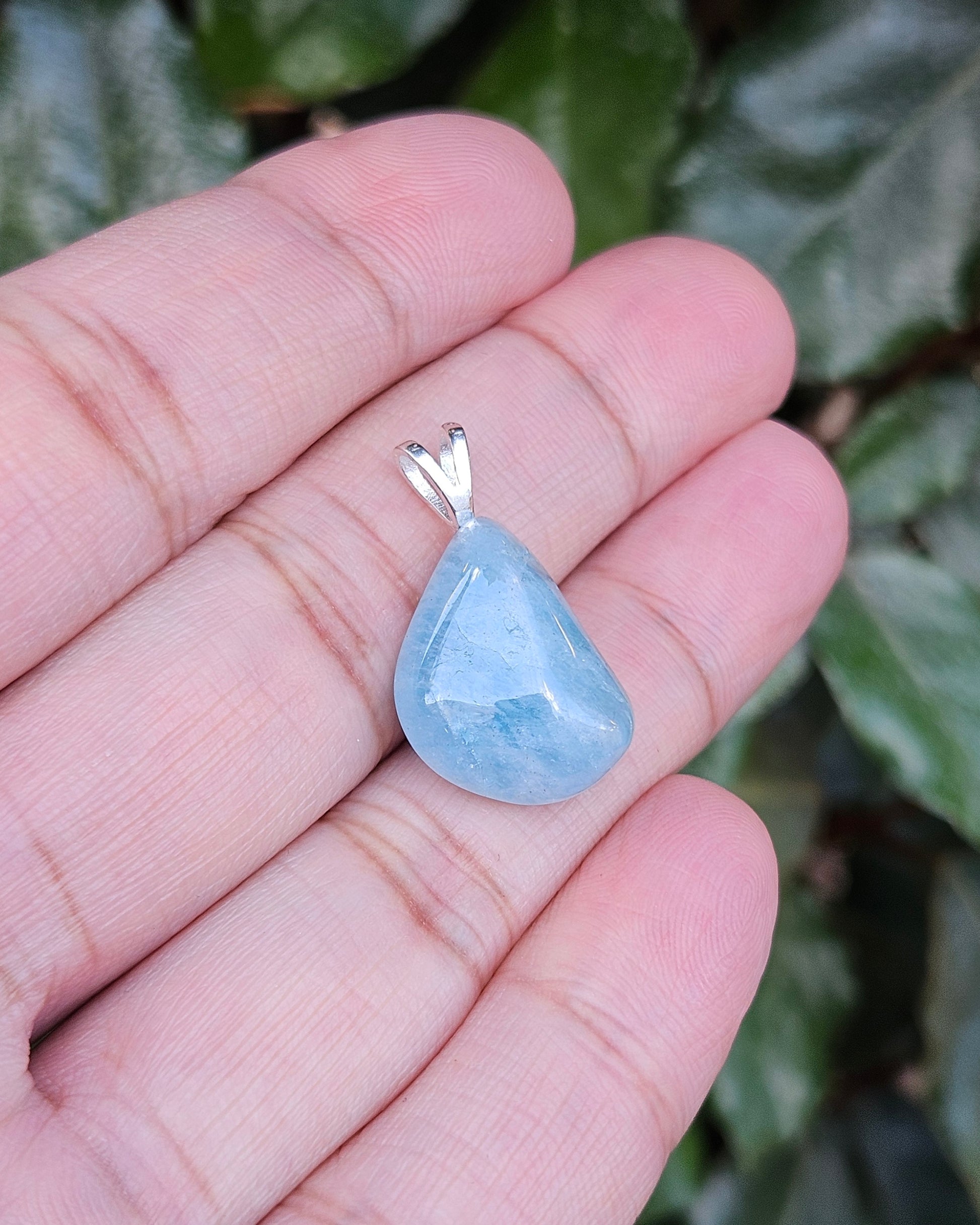 Immerse yourself in the soft, ocean-blue energy of this free-form aquamarine pendant. Its silver eyelet makes it easy to wear. Aquamarine supports the release of fear, inspires courage, and strengthens intuition. Perfect for those seeking more harmony and clarity in their lives.