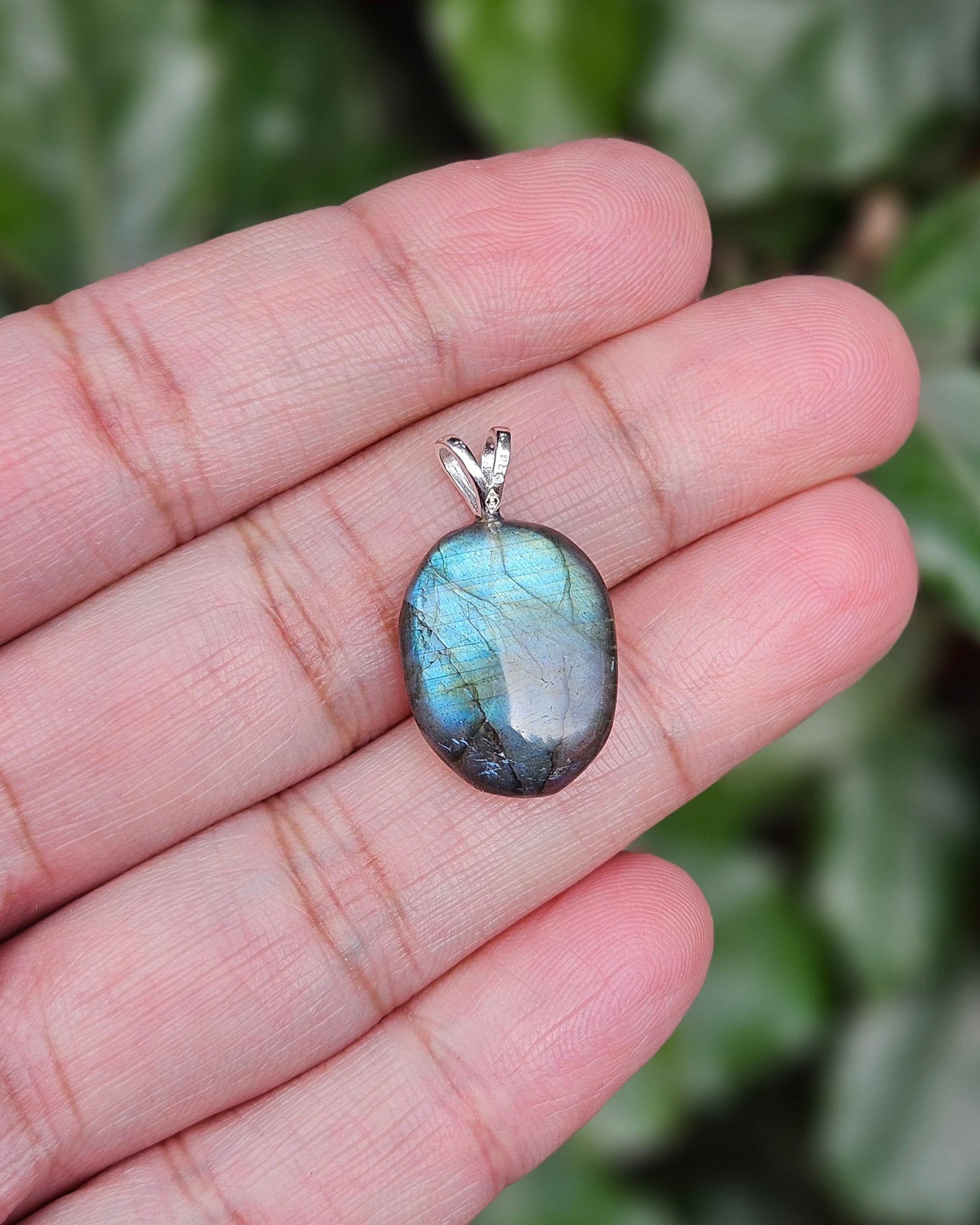 With its subtle color and soft sheen, this labradorite with a silver pendant eye makes an elegant addition to any necklace. Labradorite acts as a mirror of the soul: it reveals hidden talents and promotes spiritual growth. Wear it daily for a sense of inner strength and protection.