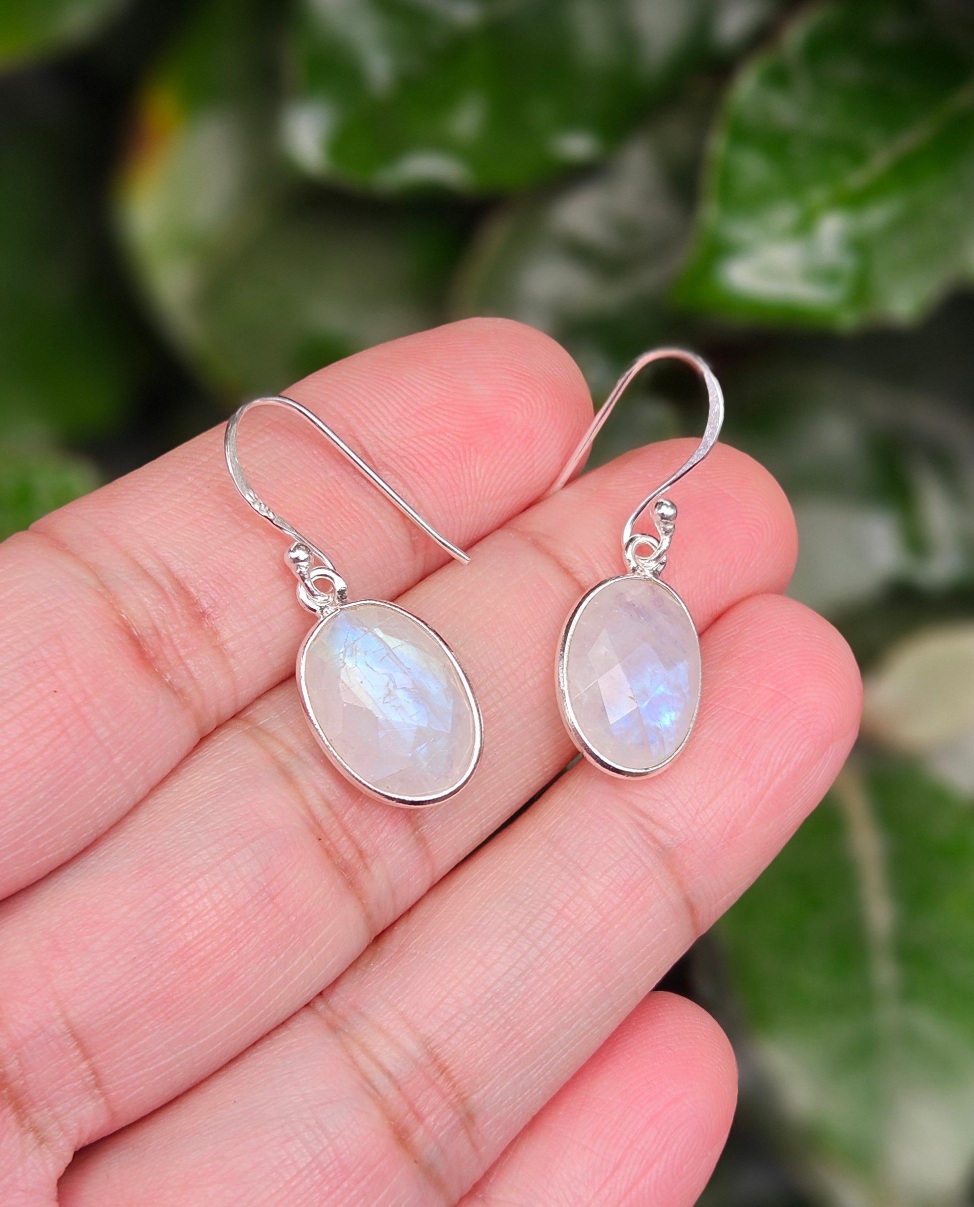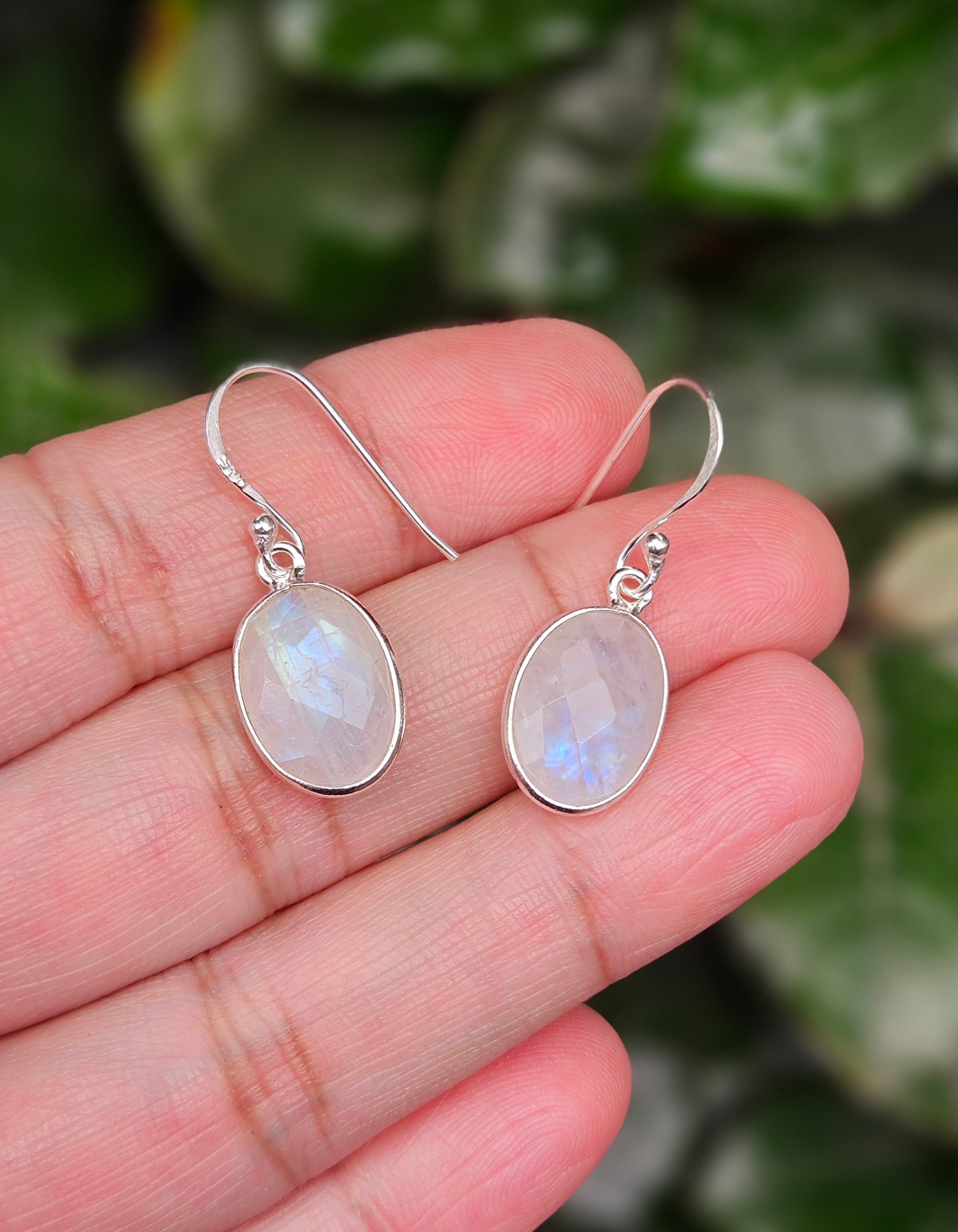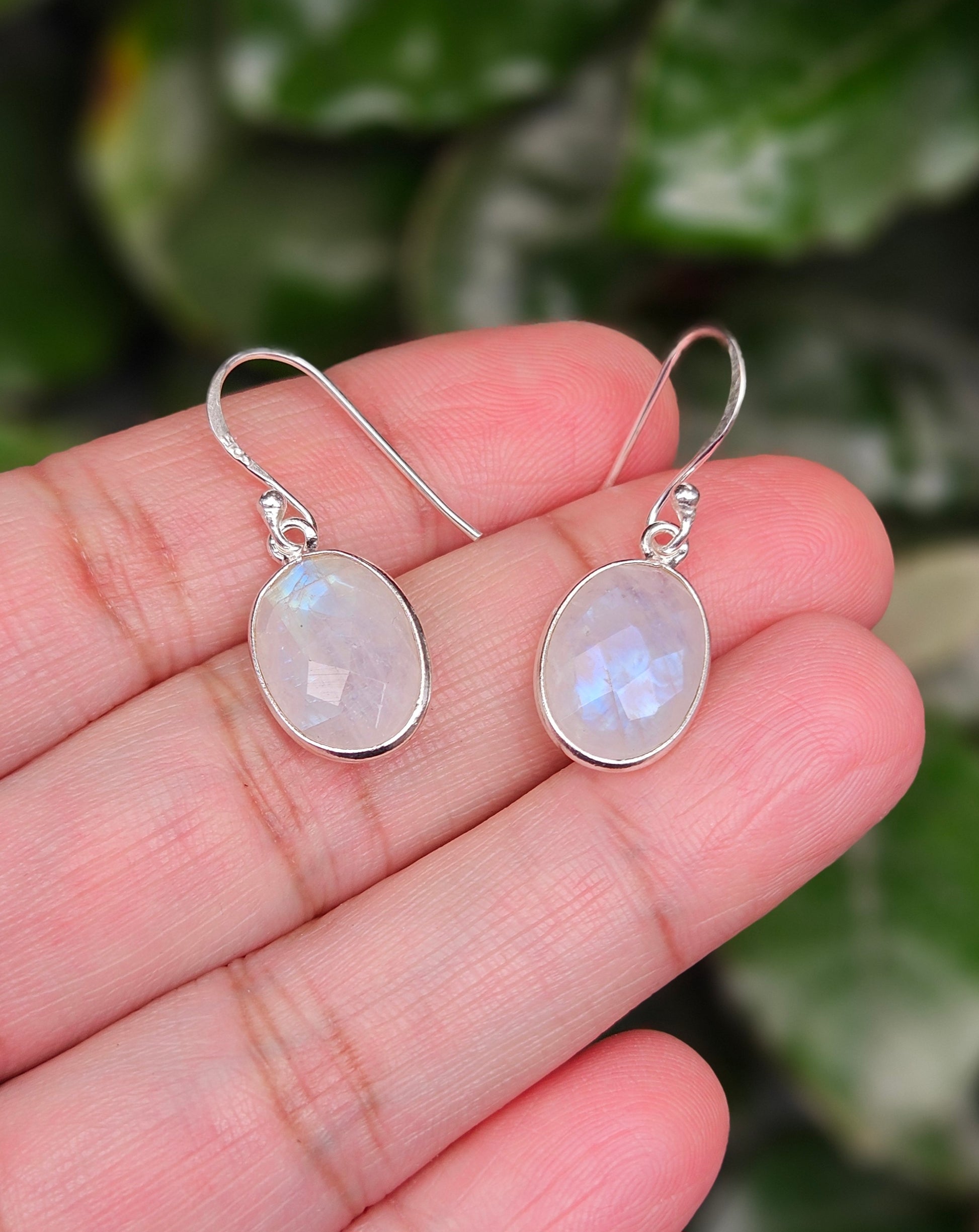 Deze ovale facetgeslepen maansteen oorhangers combineren verfijning met een subtiele, natuurlijke schittering. De maansteentjes zijn nauwkeurig in facet geslepen, waardoor zij het licht op een sprankelende manier vangen en hun kenmerkende zachte, blauwe gloed – de bekende adularescentie – prachtig wordt benadrukt.