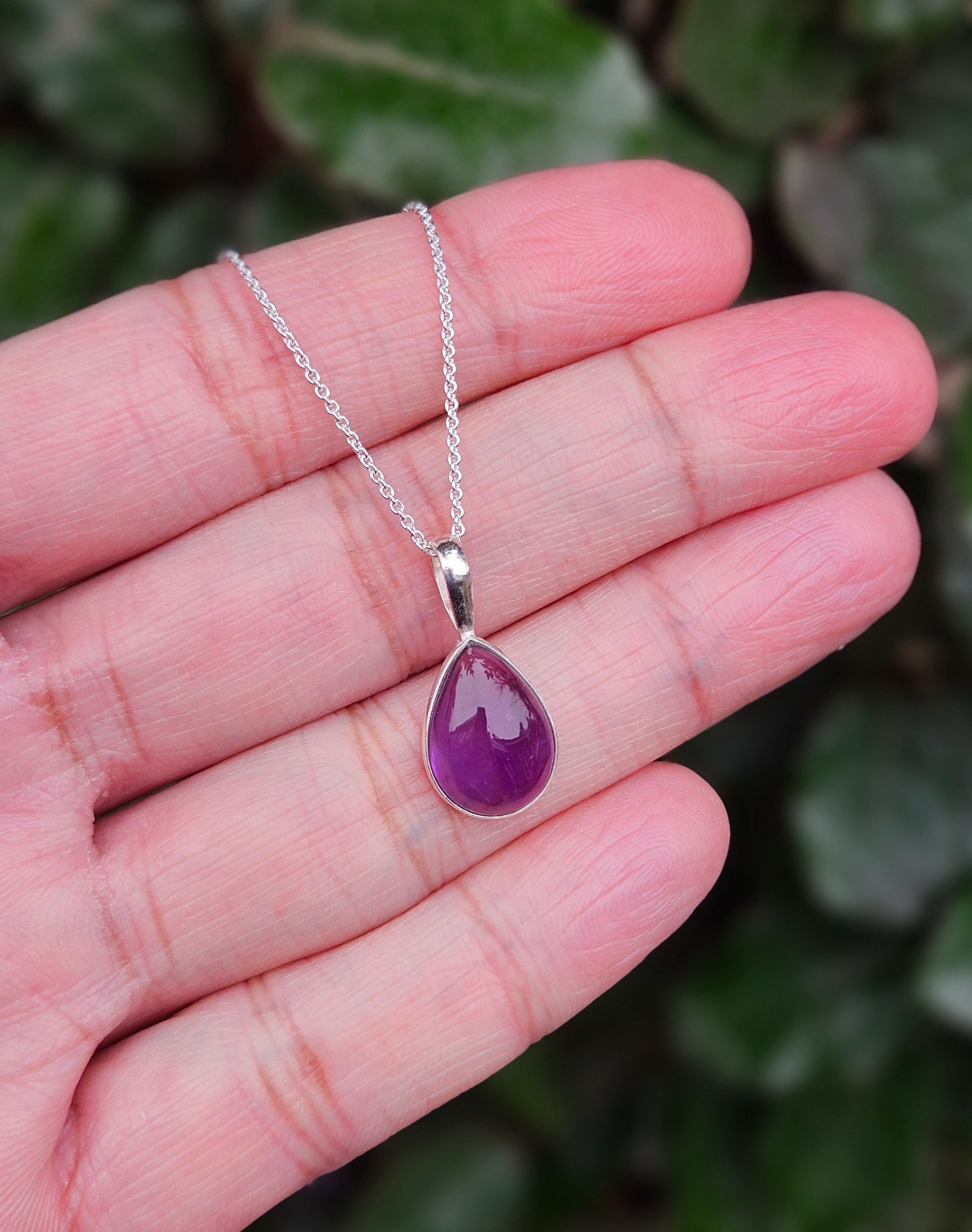 Deze elegante ketting is vervaardigd uit 925 sterling zilver en voorzien van een prachtig cabochon geslepen amethist in zachte druppelvorm. De gladde slijping laat de diepe paarse tinten helder spreken en geeft de steen een serene, bijna mystieke uitstraling. Subtiel en verfijnd – een sieraad dat rust en kracht uitstraalt. Amethist staat bekend als een krachtige spirituele steen die rust, bescherming en inzicht brengt. Door de eeuwen heen wordt zij gezien als een steen van bewustwording en innerlijke groei.