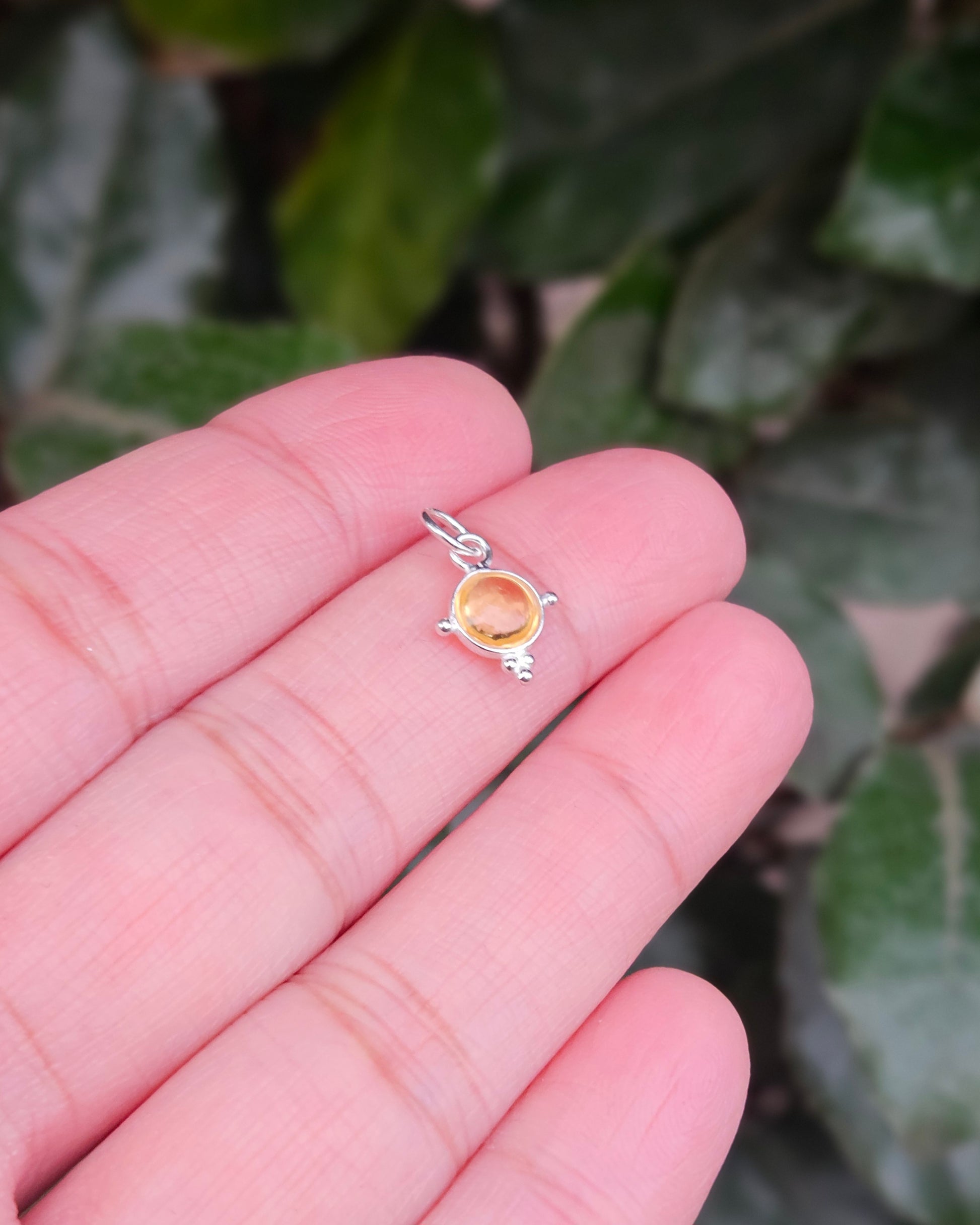 Deze kleine, verfijnde zilveren hanger is gezet met een warme citrien in een gladde cabochon slijpvorm. De zachte, bol gepolijste afwerking benadrukt de heldere honinggele tinten van de steen en geeft het sieraad een subtiele, elegante uitstraling.