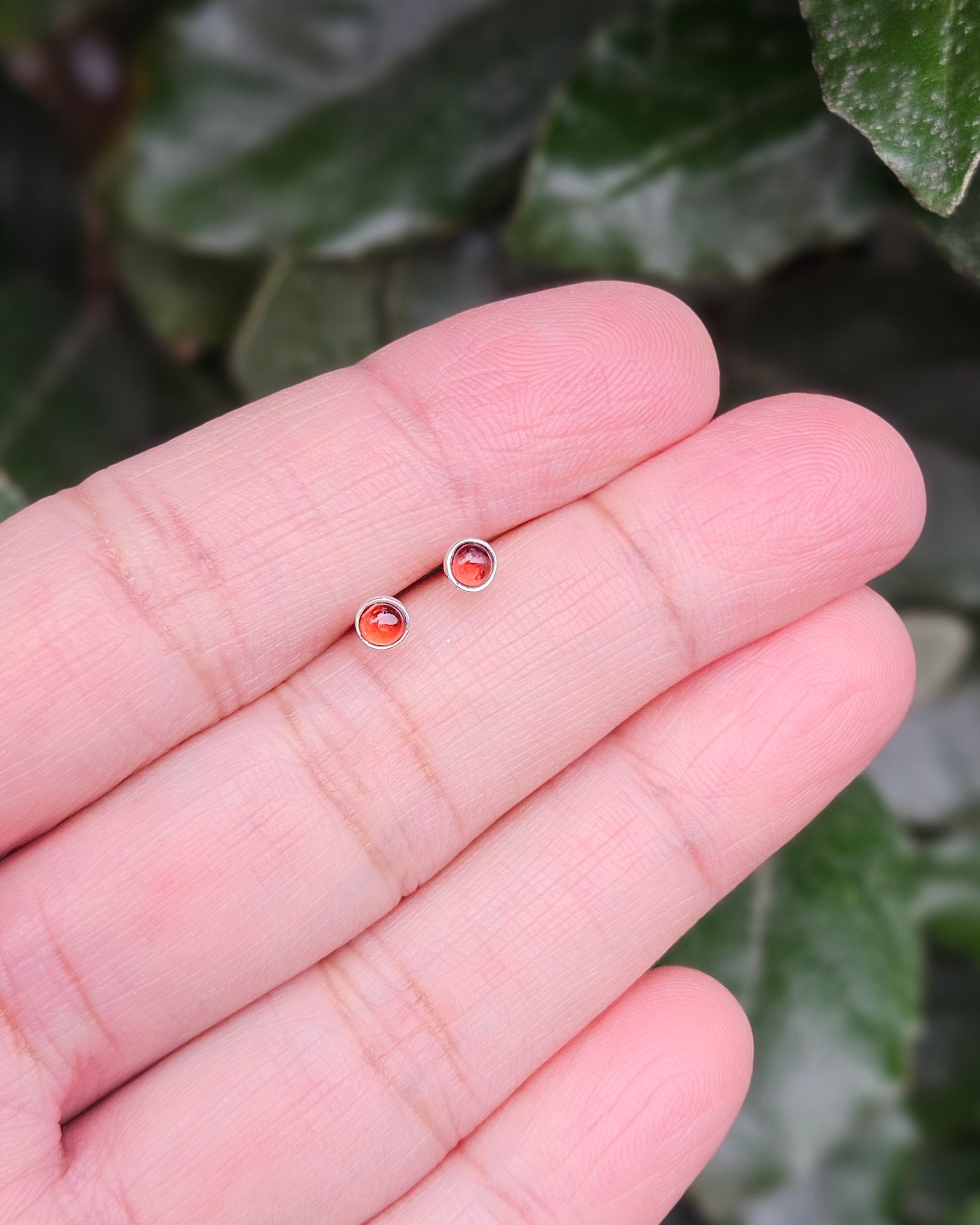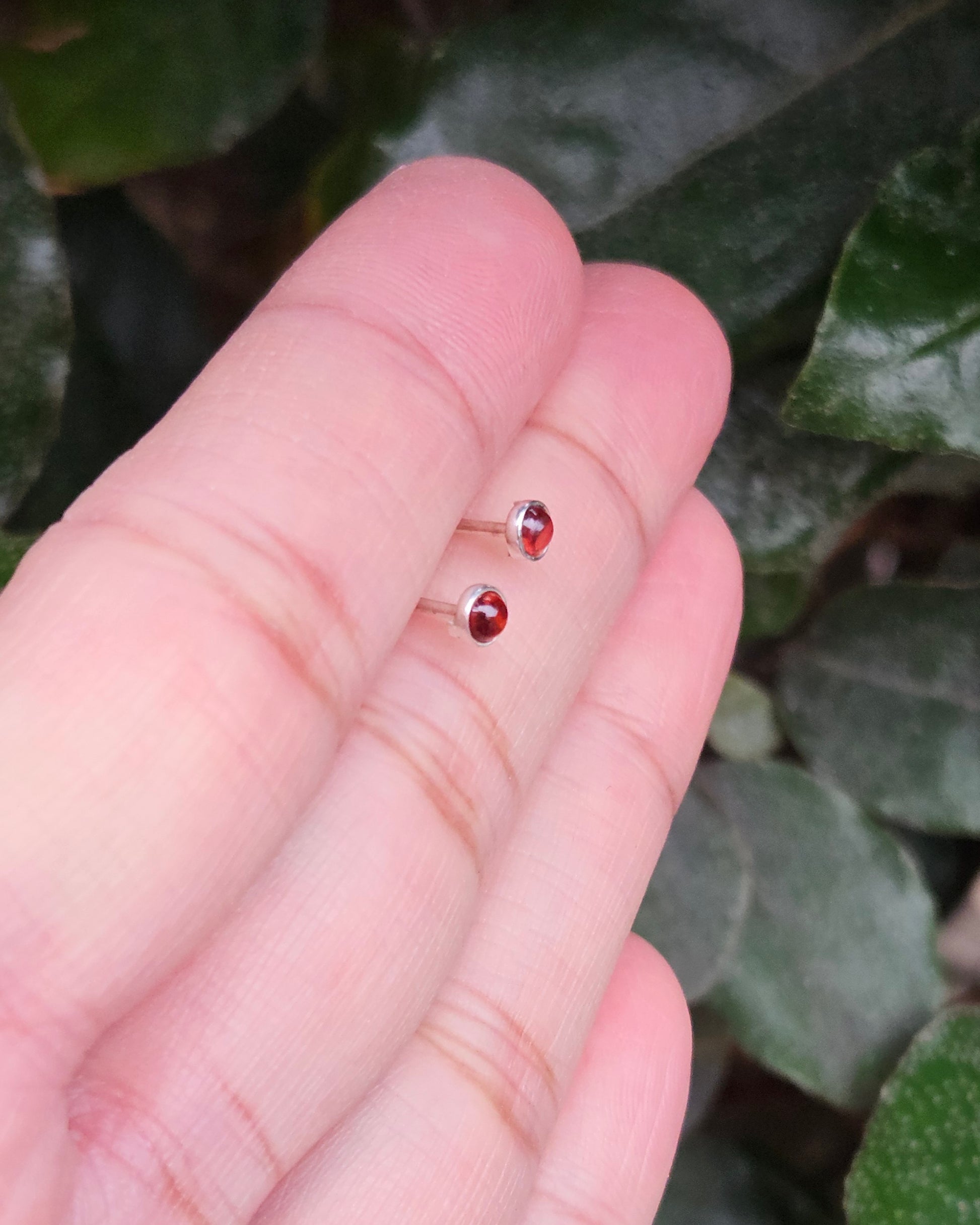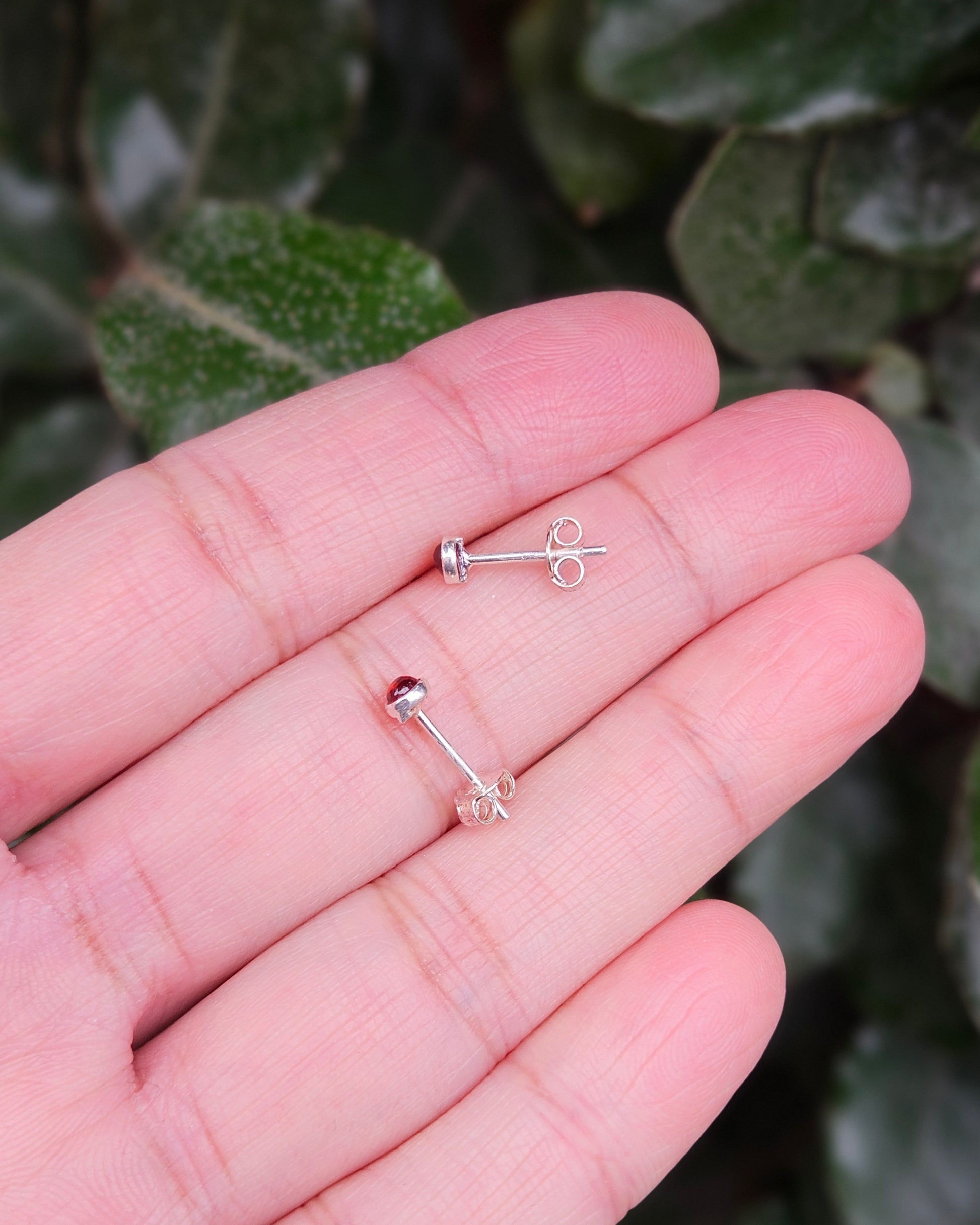 Kleine oorstekers van cabochon geslepen granaat in zilver. Perfecte elegante toevoeging aan elke sieradencollectie.
